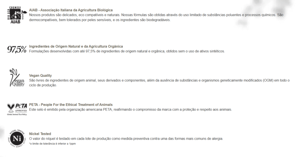 Nossas fórmulas contêm até 97,5% de ingredientes de origem natural e da agricultura orgânica. A “Certificação de Qualidade Vegana” assegura a ausência de ingredientes ou componentes de origem animal. Em cada lote de produção, realizamos uma verificação rigorosa do valor do Níquel* para garantir a segurança das peles mais sensíveis.