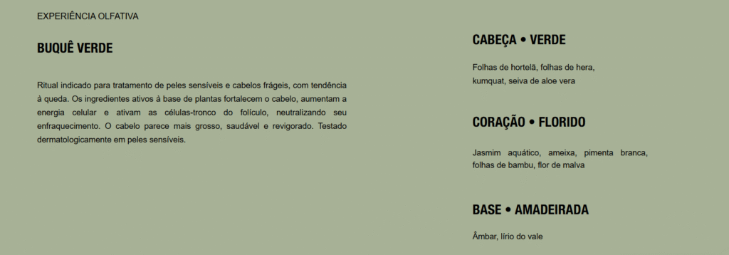 Ritual indicado para tratamento de peles sensíveis e cabelos frágeis, com tendência à queda. Os ingredientes ativos à base de plantas fortalecem o cabelo, aumentam a energia celular e ativam as células-tronco do folículo, neutralizando seu enfraquecimento. O cabelo parece mais grosso, saudável e revigorado. Testado dermatologicamente em peles sensíveis.